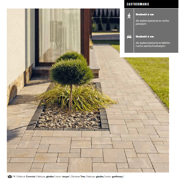 Kostka Brukowa Commix to znakomita propozycja dla tych, którzy poszukują niebanalnej nawierzchni wokół swojej posesji. Umożliwia ona kreowanie oryginalnych i stylowych aranżacji oraz różnorodnych, ciekawych wzorów. Kolakecja zlożona z 4 kamieni. Komplet wymiarów na palecie. Dostępne kolory: Adular (biało-stalowy), Boho (biało-grafitowo-ochrowy), cortado (brązowo-biały), cosmo (czarno-biało-szary), hawaii (brązowo-pomarańczowy), ivory (biało-beżowy), latte (biało-jasnopiaskowy), nerino (biało-szaro-czarny), taupe (mokka-stalowo-biały), szary, grafitowy. Zalety produktu: Szeroka gama nowoczesnych kolorów melanżowych, umożliwia tworzenie niebanalnych i stylowych nawierzchni, gładka faktura podkreślająca kolorystykę, wszechstronność zastosowań. Kostka Brukowa Commix to doskonały wybór dla osób ceniących estetykę, nowoczesność i indywidualny charakter przestrzeni. |
