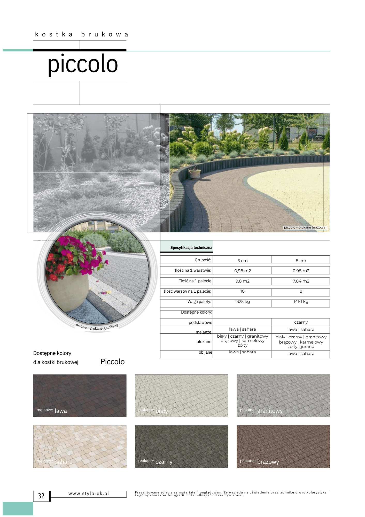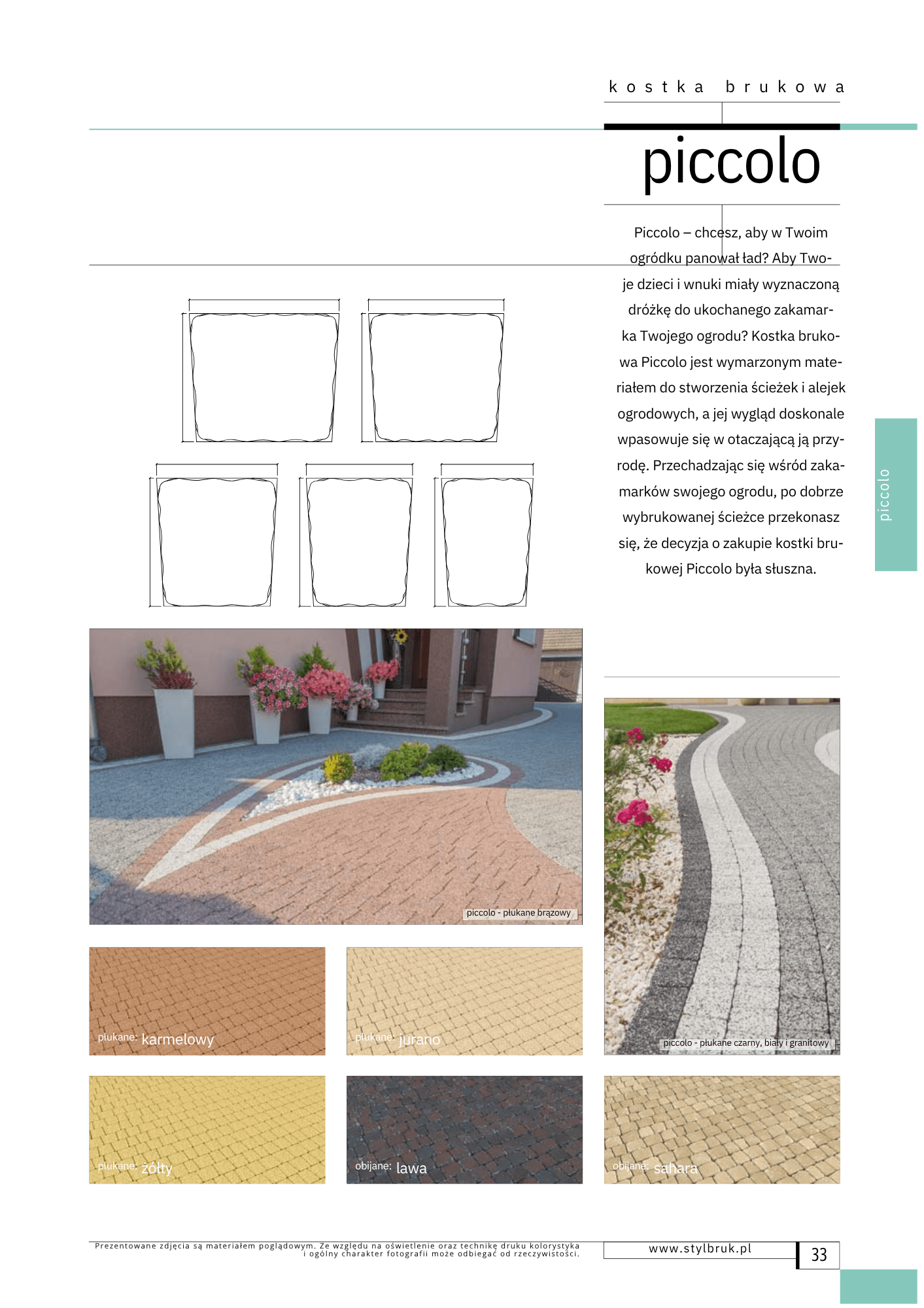 Chcesz, aby w Twoim ogródku panował ład? Aby Twoje dzieci i wnuki miały wyznaczoną dróżkę do ukochanego zakamarka Twojego ogrodu? Kostka brukowa Piccolo jest wymarzonym materiałem do stworzenia ścieżek i alejek ogrodowych, a jej wygląd doskonale wpasowuje się w otaczającą ją przyrodę. Przechadzając się wśród zakamarków swojego ogrodu, po dobrze wybrukowanej ścieżce przekonasz się, że decyzja o zakupie kostki brukowej Piccolo była słuszna. Dostępne kolory: lawa, sahara, biały, czarny, granitowy, brązowy, karmelowy, żółty, jurano. Dostępne grubości: 6 cm, 8 cm lawa, sahara biały, czarny, granitowy, brązowy, karmelowy, żółty, jurano lawa, sahara