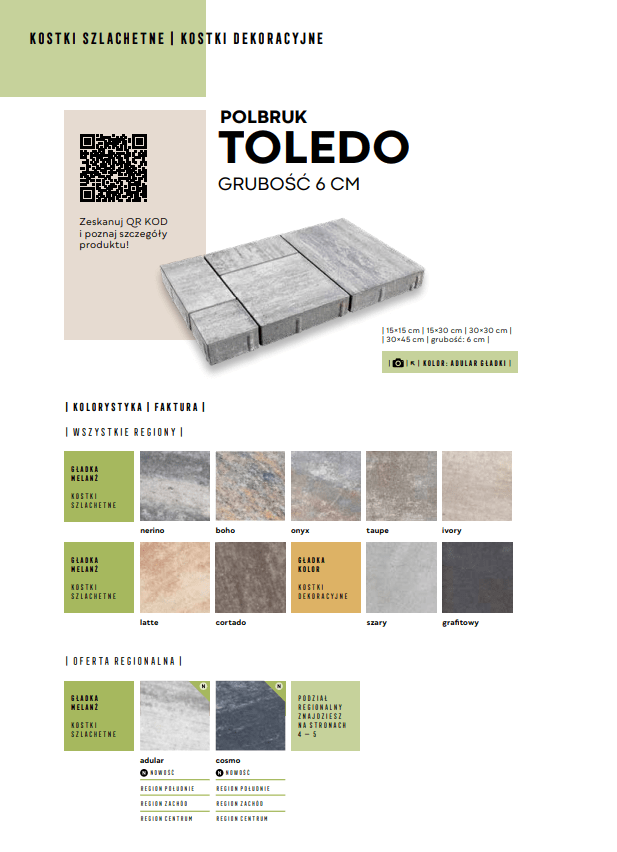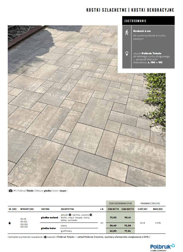 Kostka Polbruk Toledo to propozycja dla osób poszukujących stylowej aranżacji nawierzchni wokół domu. Umożliwia układanie atrakcyjnych mozaik, ponieważ jest dostępna w komplecie czterech rozmiarów: 15×15, 15×30, 30×30 i 30×45 cm. Znajduje zastosowanie w strefie wejściowej – na podjazdach i chodnikach, oraz w ogrodzie – na tarasach i alejkach. Ciekawa forma i bogata kolorystyka czynią ją uniwersalnym rozwiązaniem, które doskonale sprawdza się w każdym stylu. Zróżnicowanie wielkości kostek oraz duży wybór kolorów pozwalają również na wyróżnienie poszczególnych stref lub tworzenie oryginalnych, geometrycznych wzorów. Dostępne grubości: 6 cm Dostępne faktury: gładka Kolorystyka:nerino (biało-szaro-czarny), ivory (biało-beżowy), boho (biało-grafitowo-ochrowy), taupe (mokka-stalowo-biały), onyx (biało-szaro-pomarańczowy), latte (biało-jasnopiaskowy), cortado (brązowo-biały), adular (biało-stalowy), cosmo (czarno-biało-szary), szary, grafitowy. Zalety produktu: Komplet czterech rozmiarów umożliwiający tworzenie mozaik, ciekawa forma i bogata kolorystyka, uniwersalne rozwiązanie pasujące do każdego stylu, Możliwość tworzenia oryginalnych, geometrycznych wzorów. Kostka Brukowa Toledo to doskonały wybór dla osób ceniących estetykę, kreatywność i wszechstronność w aranżacji nawierzchni.