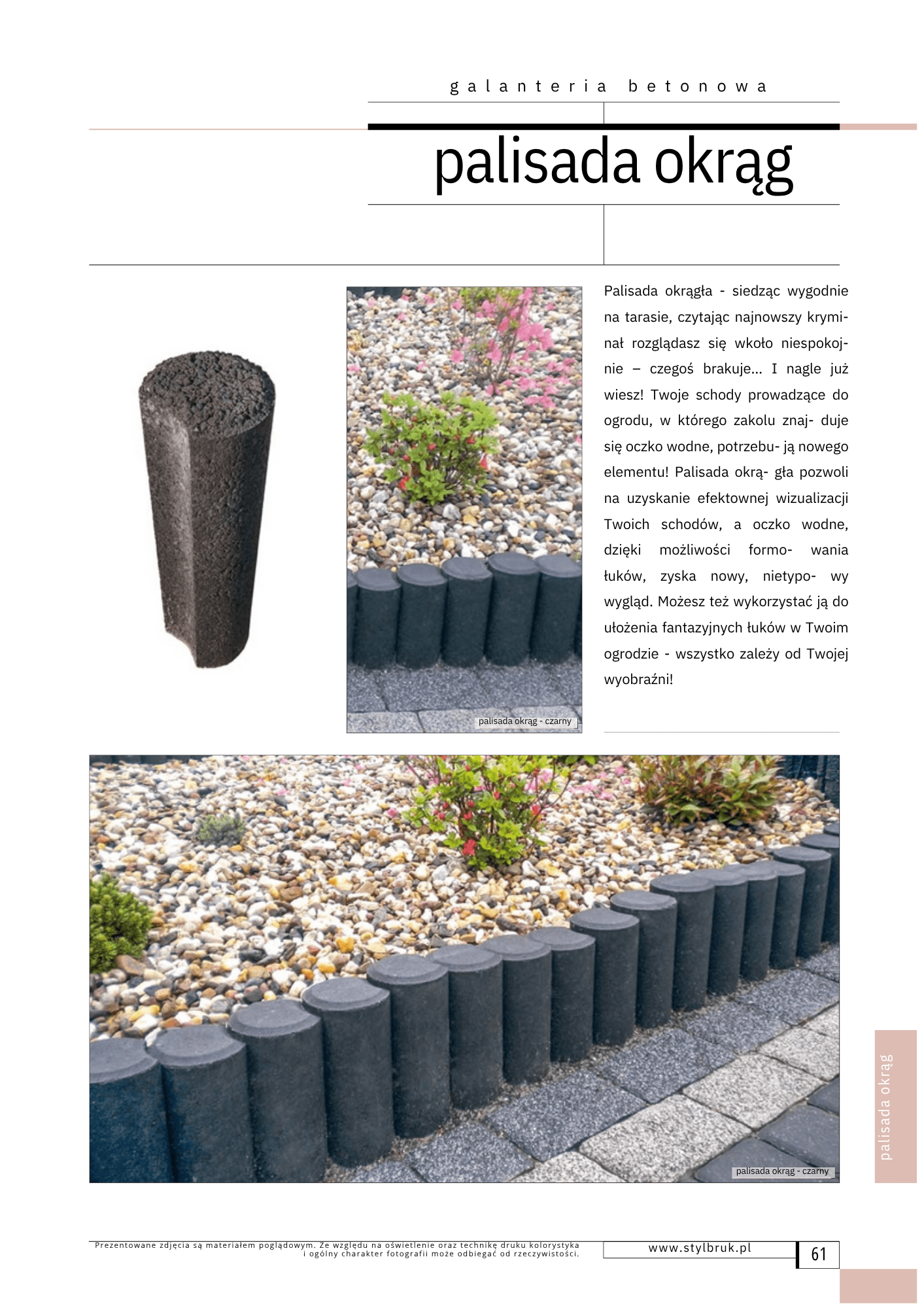 | Siedząc wygodnie na tarasie, czytając najnowszy kryminał rozglądasz się wkoło niespokojnie – czegoś brakuje… I nagle już wiesz! Twoje schody prowadzące do ogrodu, w którego zakolu znajduje się oczko wodne, potrzebują nowego elementu! Palisada okrągła pozwoli na uzyskanie efektownej wizualizacji Twoich schodów, a oczko wodne, dzięki możliwości formowania łuków, zyska nowy, nietypowy wygląd. Możesz też wykorzystać ją do ułożenia fantazyjnych łuków w Twoim ogrodzie – wszystko zależy od Twojej wyobraźni. Dostępne kolory: czarny, szary. | 11x9x40 cm |