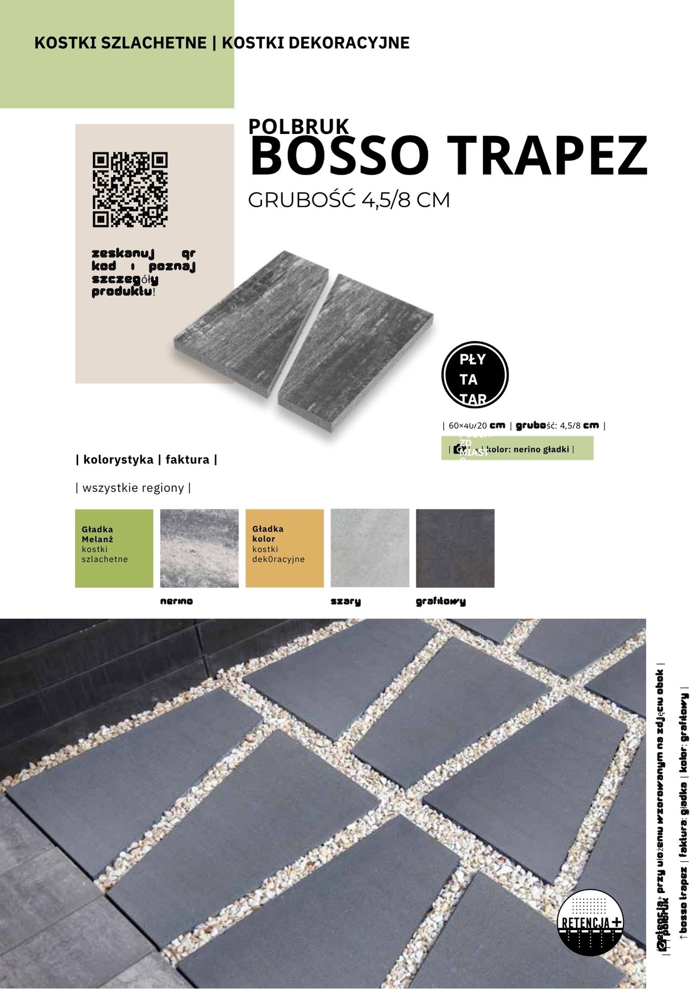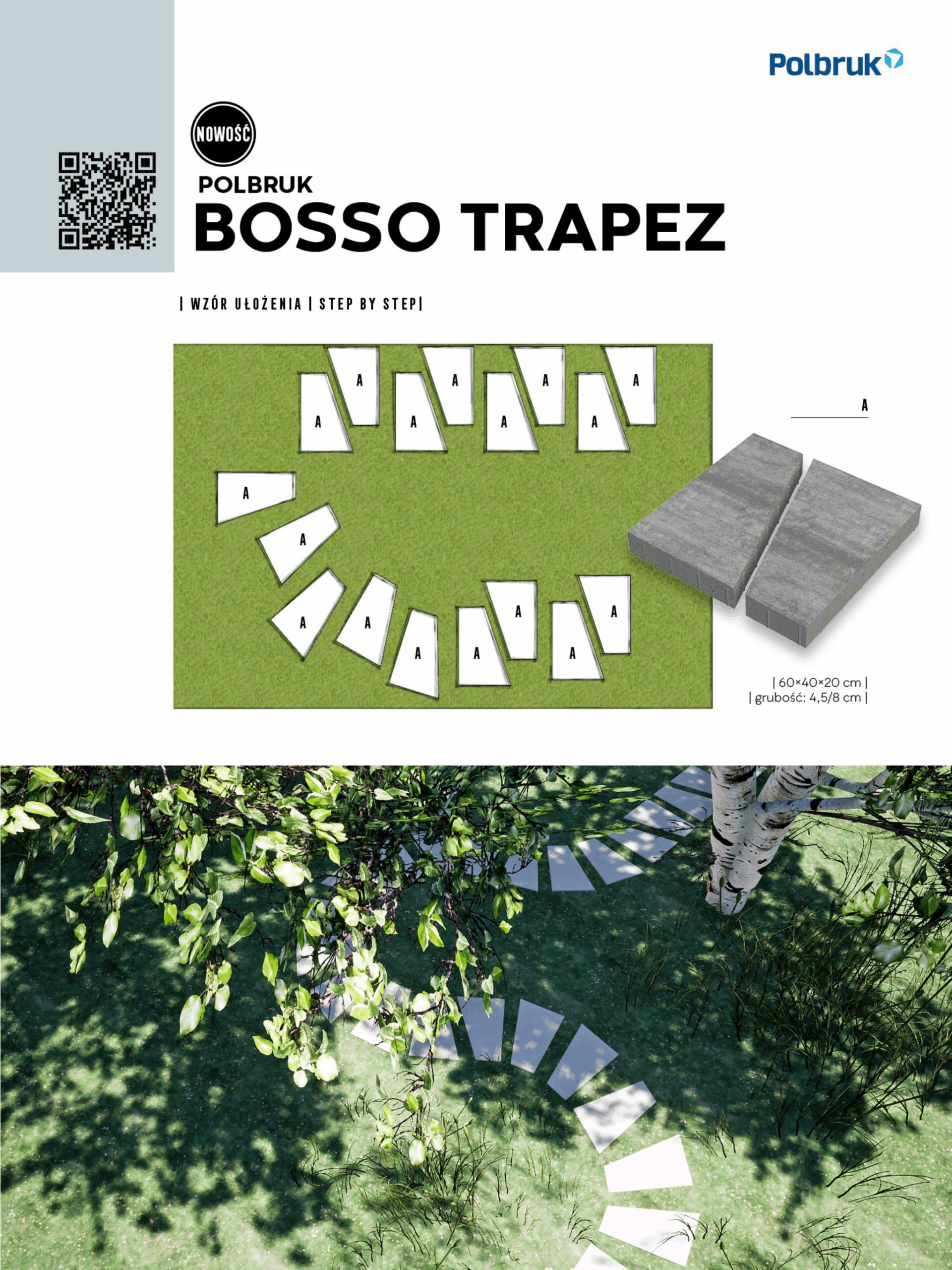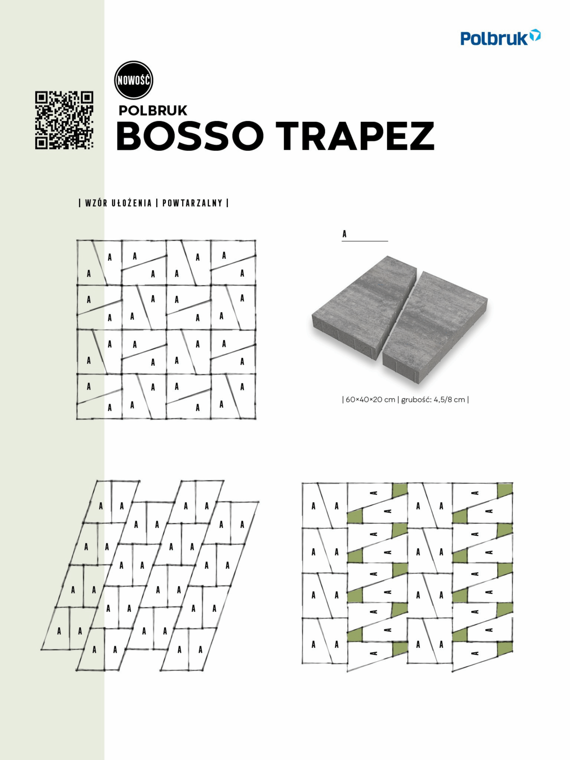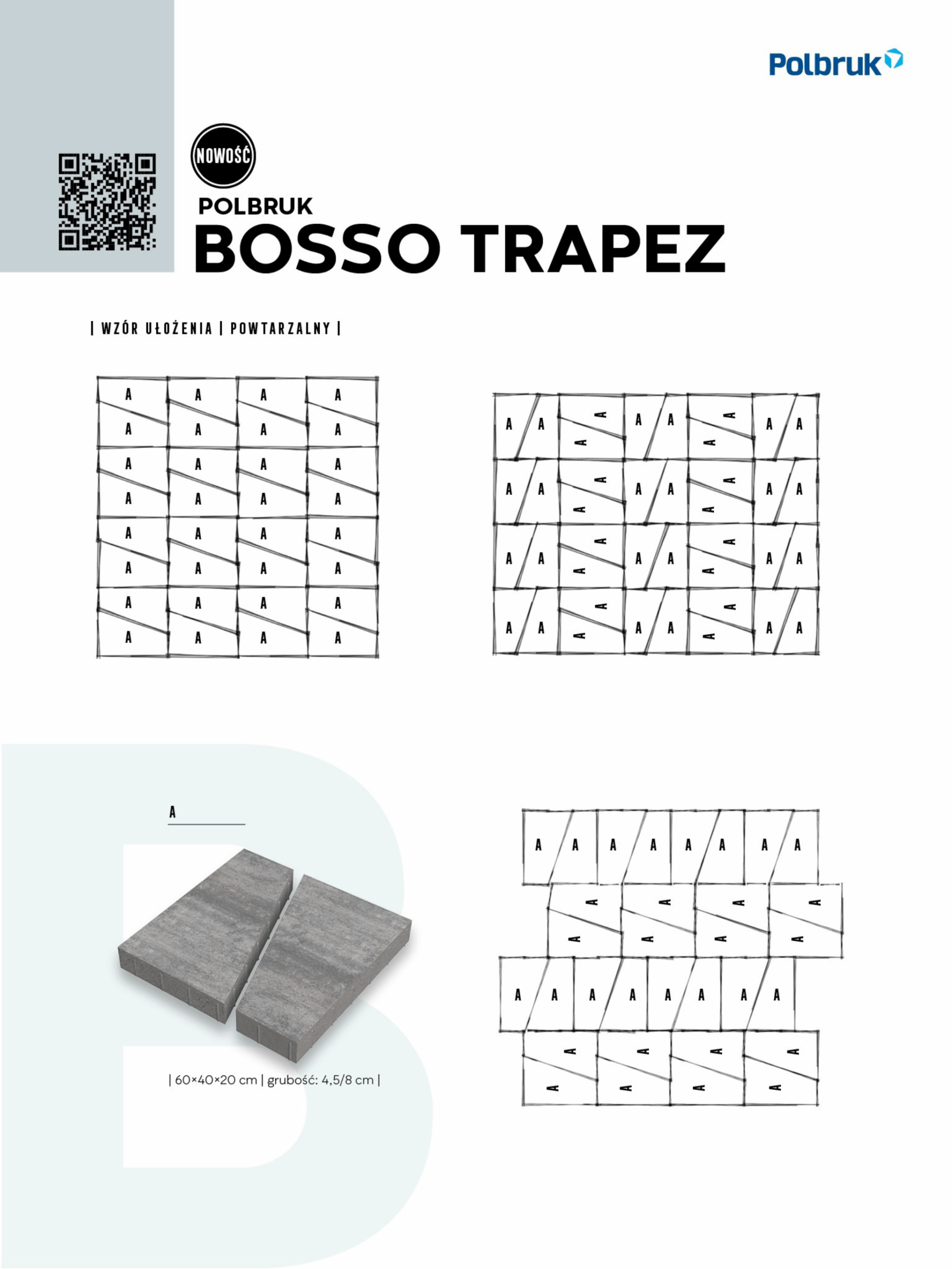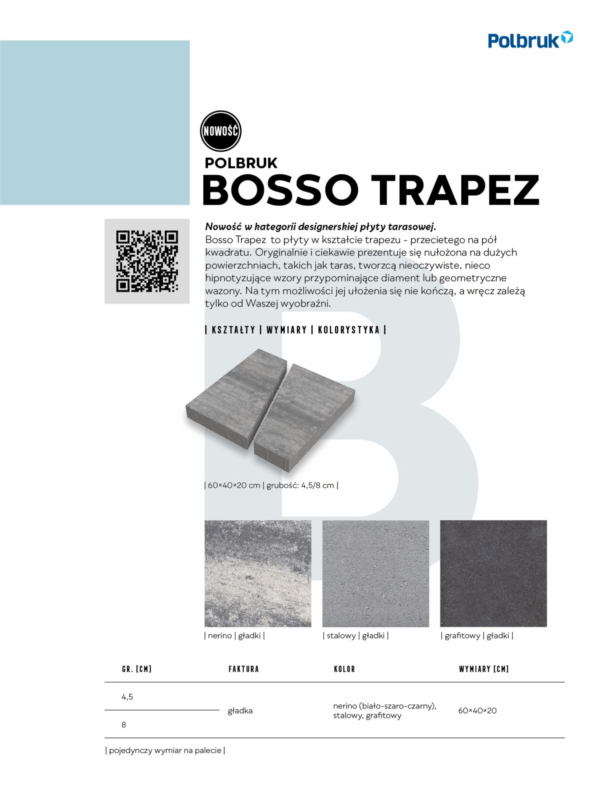 Jest to nowość w kategorii designerskich wielkoformatowych płyt betonowych. Płyta Bosso Trapez ma kształt trapezu, który można opisać jako kwadrat przecięty na pół. Prezentuje się niezwykle oryginalnie i ciekawie, szczególnie na dużych powierzchniach, takich jak tarasy, tworząc nieoczywiste, niemal hipnotyzujące wzory przypominające diamenty lub geometryczne wazony. Możliwości jej ułożenia są praktycznie nieograniczone i zależą wyłącznie od wyobraźni projektanta. Dostępne grubości: 4,5 cm, 8 cm Kolorystyka: grafitowy, nerino, stalowy Faktura: Gładka Zalety produktu: Designerski kształt trapezu, umożliwia tworzenie nieoczywistych, hipnotyzujących wzorów, nowoczesny i orygnalny wygląd, dostępna w dwóch grubościach. Płyta betonowa Bosso Trapez to doskonały wybór dla osób ceniących estetykę, kreatywność i unikalne rozwiązania w aranżacji tarasów.
