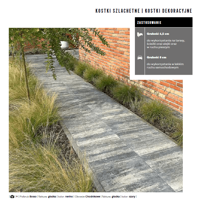 Zalety produktu: Elegancki, minimalistyczny i nowoczesny design, wielkoformatowy charakter ułatwiający układanie, dostępność w dwóch grubościach dla różnych zastosowań, możliwość stosowania na podjazdach (gr. 8 cm).
