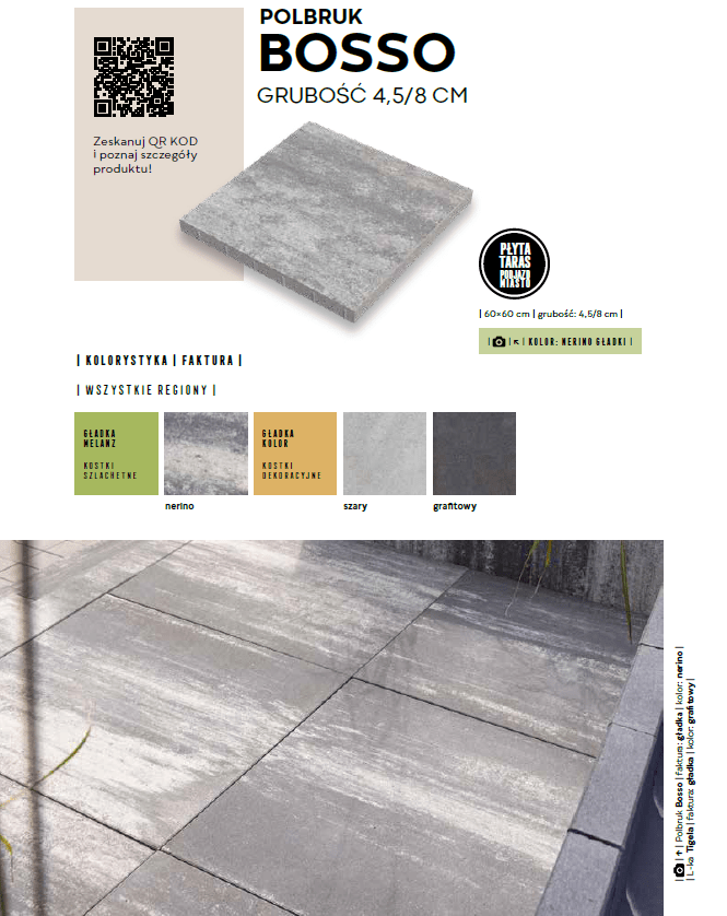 Polbruk Bosso wyróżnia się jako elegancka i wszechstronna wielkoformatowa betonowa płyta. Ma kształt kwadratu o wymiarach 60×60 cm i cechuje ją minimalistyczny oraz nowoczesny design. Stanowi doskonały wybór dla osób ceniących minimalizm oraz spójność w aranżacji wszystkich nawierzchni na terenie posesji. Płyty betonowe Bosso można z powodzeniem stosować w strefie wejściowej, na chodnikach, tarasach, alejkach ogrodowych, a także na podjazdach. Jest to możliwe dzięki dostępności w dwóch grubościach: 4,5 cm oraz 8 cm. Warto zaznaczyć, że płyty Bosso o grubości 8 cm są przystosowane do lekkiego ruchu samochodowego, do 3,5 tony.